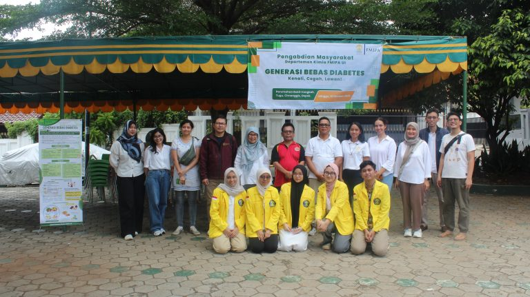 The atmosphere at the RW 15 Basketball Court in Tugu Subdistrict, Cimanggis District, looked different on Sunday (12 October 2025). Aerobic music echoed from the morning, accompanied by lines of residents waiting to undergo health checks and consultations. This activity was part of a community service program (Pengmas) by the Faculty of Mathematics and Natural Sciences, Universitas Indonesia (FMIPA UI), through the Department of Chemistry, titled “A Diabetes-Free Generation: Know, Prevent, and Fight.”