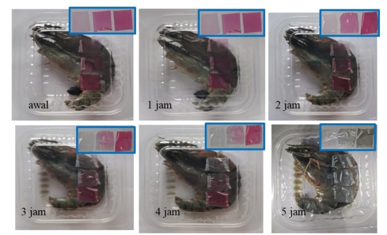 In detecting the quality of shrimp or fish freshness, color changes occur from red to purple on paper labels and red to gray on plastic labels, indicating that the shrimp or fish have been damaged. If the shrimp or fish are very rotten, the color on the label can change to yellow. Shrimp or fish damage is also validated using laboratory tests.